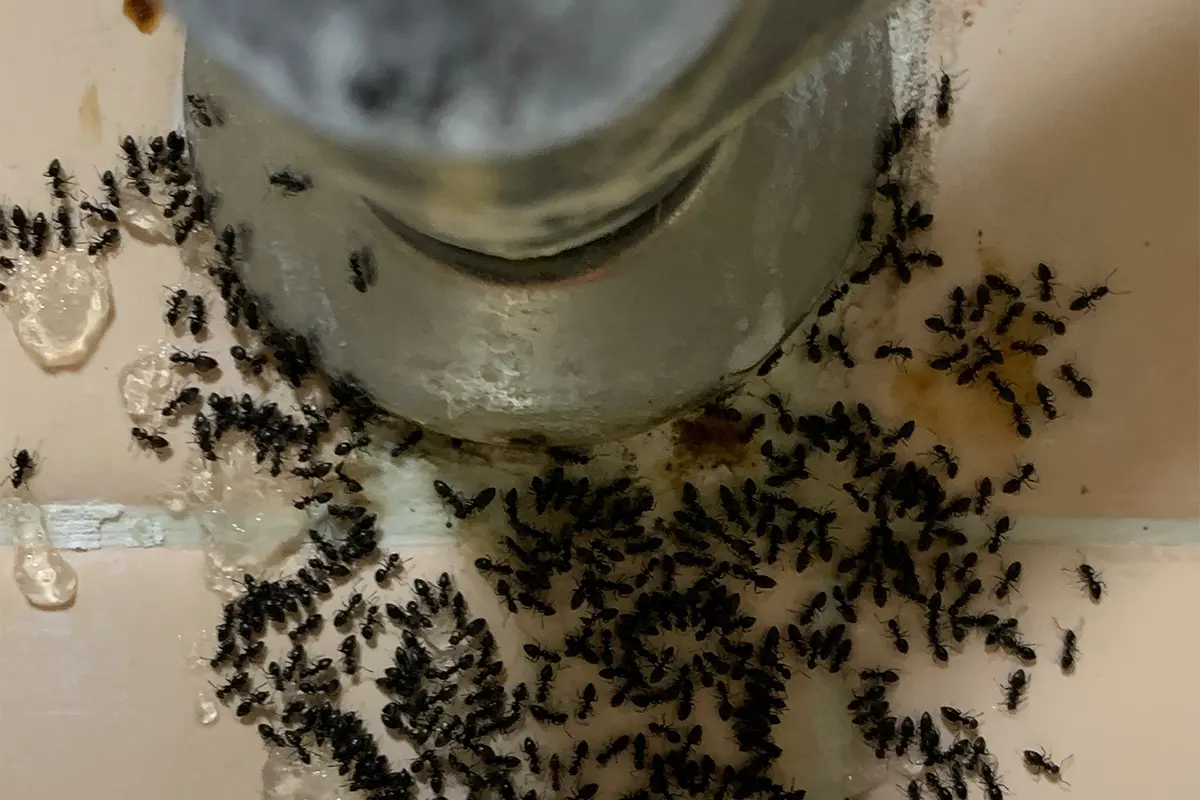 鹿児島県内では、超難防除アリとして有名な「アシジロヒラフシアリ」が大量発生しています(体長2.5ミリの黒いアリ)。家屋や住宅機器に侵入し、不快なだけでなく、エアコンや給湯器などの機器故障被害も発生しています。