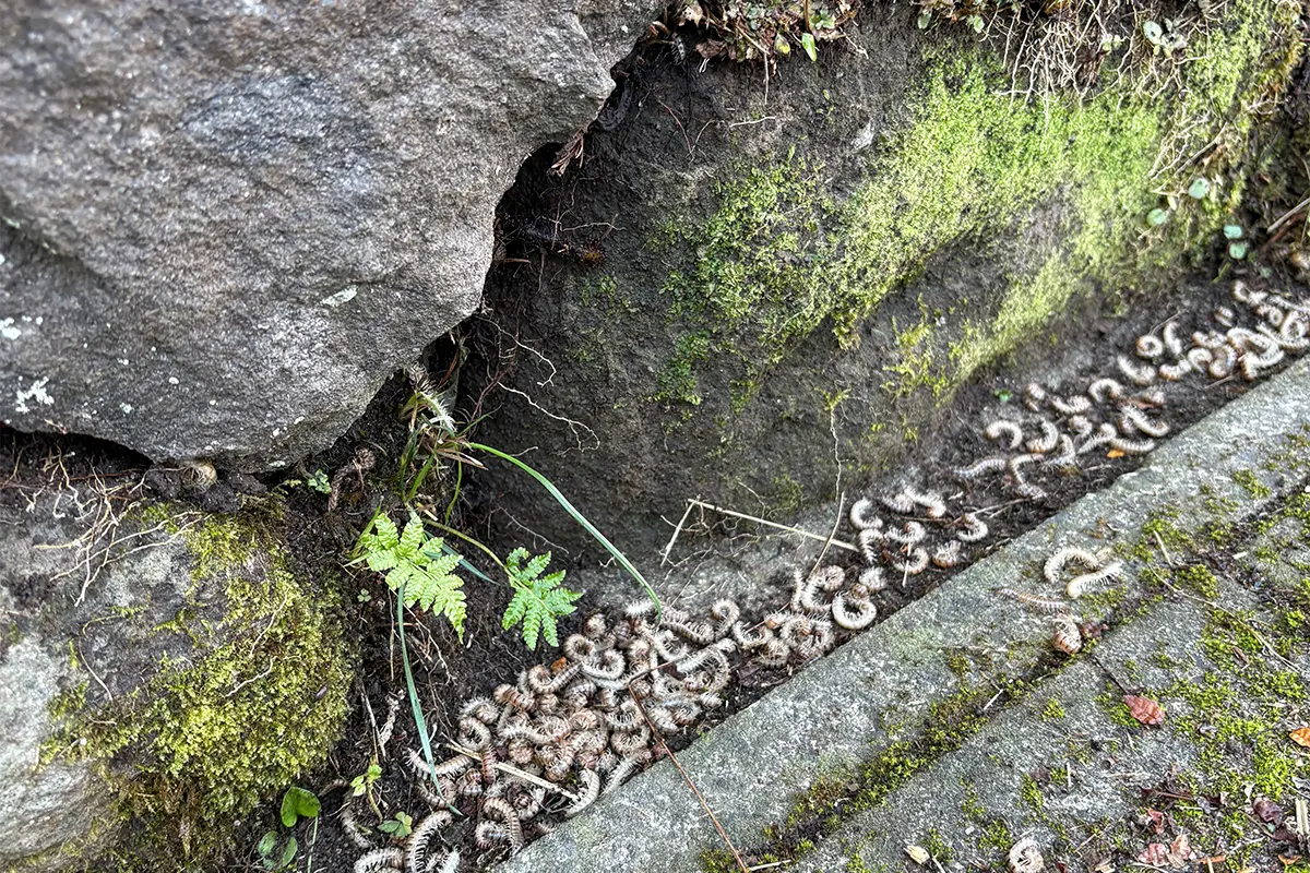 - ヤンバルトサカヤスデは地面だけでなく、石垣・擁壁の隙間やコンクリート建造物の裏側などの高所にもまとまって潜んでいます